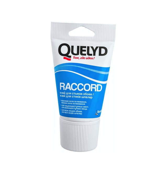 QUELYD RACCORD (Келид Раккорд) - готовый к использованию клей для подклеивания стыков всех видов обоев. Применяется для бумажных, виниловых, флизелиновых обоев и других стеновых покрытий. Подходит для наклеивания небольших бордюров. Удобный тюбик с носиком аппликатором позволяет аккуратно проклеить труднодоступные места, при необходимости отремонтировать отклеившиеся в ходе эксплуатации участки обоев. Клей готов к использованию - не разбавлять водой. Нанести тонкий слой клея на стену или на обратную сторону обоев. Избегать подтеков клея на поверхность обоев. Оставить на 5 минут для улучшения схватывающей способности и повышения адгезии. Приложить наклеиваемую часть и прижать в области шва в течение нескольких минут. Быстро удалить излишки клея чистой и влажной губкой. ОЧИСТКА: Инструменты и свежие пятна клея очищать водой.