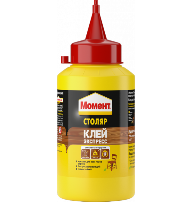 Универсальный влагостойкий клей для всех пород дерева на основе водной дисперсии. Надежно схватывает за 15 минут. Универсальный водостойкий клей на основе водной дисперсии, подходящий для всех пород дерева.