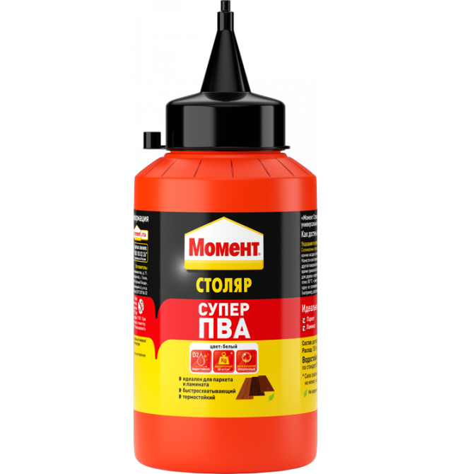 Момент Супер ПВА D2 является идеальным решением для склеивания всех пород дерева, ламината и изделий, изготовленных из материалов на основе древесины (ДСП, ДВП, МДФ и др). Водостойкий клей, идеально подходящий для паркета и ламината.