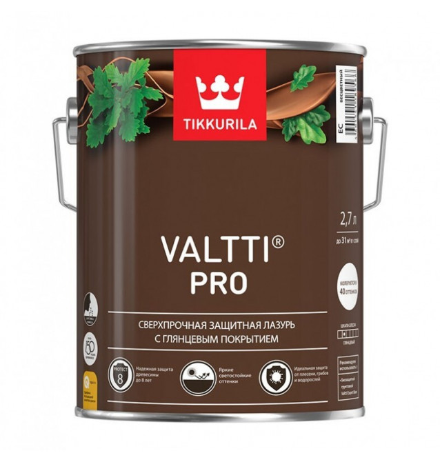 Лазурь Tikkurila Valtti Pro содержит воск и создает надежное атмосферостойкое покрытие, а глянцевый блеск не только придает поверхности декоративный эффект, но и надежно защищает ее от грязи и пыли. Предназначена для защиты и отделки деревянных поверхностей: клееный брус, вагонка, строганые и пиленые доски, балки, перила, откосы, термообработанная и пропитанная под давлением древесина. Защищает от атмосферных нагрузок, замедляя воздействие влаги, гнили, синевы и плесени. Содержит воск и УФ-фильтр, что позволяет надолго сохранить свежесть цвета и существенно продлить срок службы древесины. Образует на поверхности глянцевую пленку. Для максимально эффективной защиты необходимо комплексное использование биозащитной грунтовки Tikkurila Valtti Expert Base и лазури Tikkurila Valtti Pro, особенно для нижних венцов зданий. Состав: в состав входит УФ-фильтр, который защищает древесину от солнечных лучей и сохраняет яркие оттенки глянцевого покрытия; Степень блеска: глянец; Расход: 9 – 14 м²/л по строганой поверхности; 5 – 8 м²/л по пиленой поверхности древесины; Нанесение: кисть, распыление; Время высыхания: при t +20 ± 2°C межслойная сушка -12 часов, полное высыхание - 24 часа; Колеровка: да, по каталогу Tikkurila Valtti; Цвет: бесцветный.