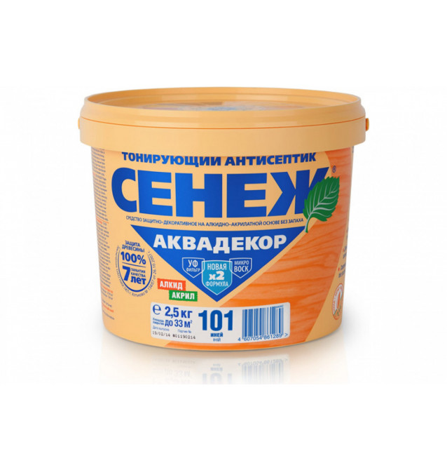 Антисептик СЕНЕЖ АКВАДЕКОР предназначен для долговременной защиты древесины от атмосферных осадков, плесневых, деревоокрашивающих и дереворазрушающих грибов, водорослей и насекомых-древоточцев, а также декоративной отделки под ценные породы. Сочетание в СЕНЕЖ АКВАДЕКОР алкидов, акрилатов и льняного масла улучшает проникновение в древесину, формирует эластичное дышащее защитное покрытие с мягким шелковистым блеском. Область применения Антисептик СЕНЕЖ АКВАДЕКОР применяют при наружных и внутренних работах для обработки новых и ранее обработанных антисептиком стен, обшивок, перегородок, фронтонов, дверей, оград, садовой мебели, фанеры, шпона, ДСП и ДВП, а также других пиленых, строганных, рубленых деревянных поверхностей. Допускается обработка антисептиком СЕНЕЖ АКВАДЕКОР полов, перил, террас с последующим покрытием устойчивым к истиранию лаком. В наличии все цвета!