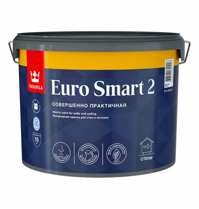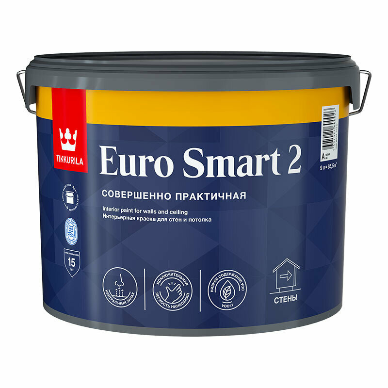 ОБЛАСТЬ ПРИМЕНЕНИЯ: Предназначена для окраски стен и потолков в сухих помещениях по бетонным, кирпичным, оштукатуренным, зашпатлеванным поверхностям, гипсокартону, древесностружечным и древесноволокнистым плитам. Может использоваться в детских учреждениях и помещениях административной группы лечебно-профилактических учреждений. ОБЪЕКТЫ ПРИМЕНЕНИЯ: Предназначена для окраски стен и потолков в сухих помещениях. БАЗА: А ЦВЕТ: Для получения пастельных оттенков воспользуйтесь компьютерной колеровкой Tikkurila. База A может использоваться в качестве белой краски. БЛЕСК: Глубокоматовый. РАСХОД: 10-12 м²/л по ровной невпитывающей поверхности; 7-9 м²/л по неровной впитывающей поверхности. РАЗБАВИТЕЛЬ: Вода. СПОСОБ НАНЕСЕНИЯ: Наносится кистью, распылением или валиком. ВРЕМЯ ВЫСЫХАНИЯ (при 20±2°C и относительной влажности 65±5 %): 2 часа перед нанесением следующего слоя. Заданный уровень устойчивости покрытия к мытью достигается через 4 недели. После мытья допускается небольшое изменение блеска покрытия. СТОЙКОСТЬ К МЫТЬЮ: Устойчива к легкому мытью мягкой поролоновой губкой. После мытья допускается небольшое изменение блеска покрытия. СТОЙКОСТЬ К МОКРОМУ ИСТИРАНИЮ: 3 класс стойкости к мокрому истиранию по стандарту ISO 11998/ DIN EN 13300.