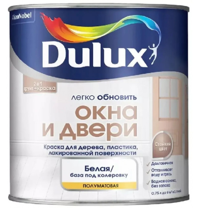 Dulux Окна и Двери — Высококачественная полуматовая краска на водной основе для окон и дверей. Прочное и долговечное покрытие устойчиво к УФ-излучению, не меняет цвет со временем. Эластичное покрытие : выдерживает перепады влажности и температуры внутри и снаружи помещения. Окрашенные поверхности не слипаются после высыхания. Не требует грунта на новых и ранее окрашенных материалах. Краска легко наносится, отлично разравнивается, образуя ровную поверхность. 2 в 1: грунт + краска, не требует грунта на новых и ранее окрашенных материалах. Область применения: Для внутренних и наружных работ. Подходит для нанесе- ния на новые и ранее окрашенные и лакированные де- ревянные поверхности, ДСП, ПВХ и предварительно за- грунтованный металл. Также может использоваться для минеральных поверхностей, откосов. Сертифицирована для применения в детских и лечебно-профилактических учреждениях. Расход: 1 литр — до 12 м2.