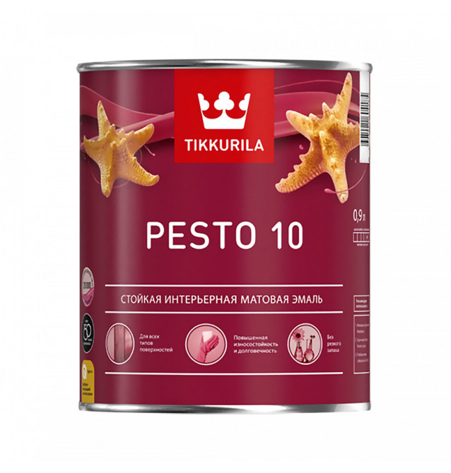 Степень блеска: 10 - матовая; 30 - полуматовая; 90 - высокоглянцевая. Стойкая универсальная матовая эмаль. Для дерева, металла и минеральных поверхностей. Универсальная эмаль Tikkurila Pesto 10/30/90 великолепно подходит для деревянных поверхностей внутри и снаружи помещений: мебели, дверей, оконных рам, а также окрашивает любые металлические поверхности, в том числе инструмент и транспорт: велосипеды, автомобили, грузовики, сельхозтехнику. Внутри помещений эмалью можно покрывать бетонные и кирпичные стены.