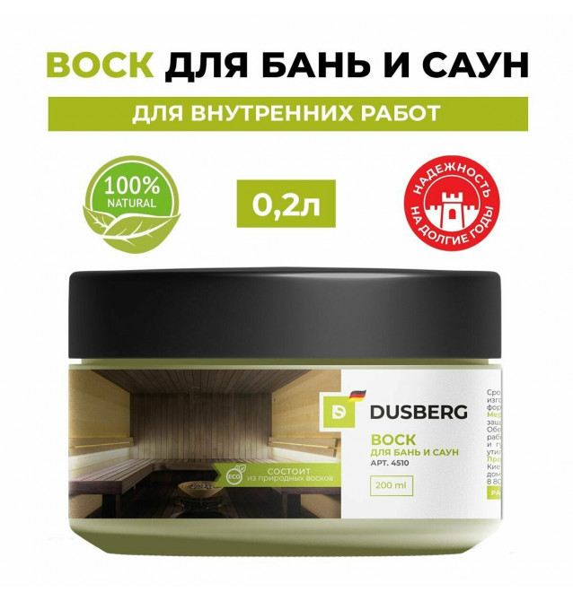 DUSBERG Воск для бань и саун – смесь природных восков для обработки внутренних поверхностей саун и бань: полков, потолков, полов, стен и иных элементов интерьера.