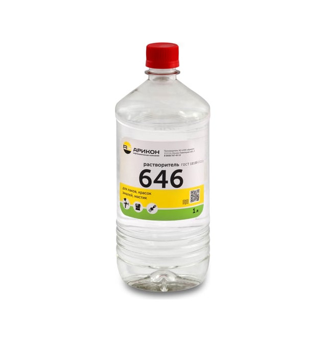 Растворитель Р-646 АРИКОН ГОСТ 18188-2020, бутылка ПЭТ 1 л RAS6461 активно применяется в автомобильной промышленности для: разбавления загустевшей краски, лаков, грунтовок, шпаклевок удаления пятен с кузова и деталей автомобиля от органических веществ. Отлично подходит для разбавления лаков, эмалей и грунтвок используемых для защиты от внешних воздействий на пластиковых, деревянных и металлических поверхностях. Растворитель 646используется для промывания и очистки: лакокрасочных инструментов: кистей, валиков, емкостей и пр. лакокрасочного технического оборудования: краскопульта, сопла, емкостей для краски и т.д. При применении краскопульта эмаль/лак/грунтовку разбавлять в зависимости от диаметра сопла и планируемой толщины пленки покрытия, согласно рекомендации производителя ЛКМ.