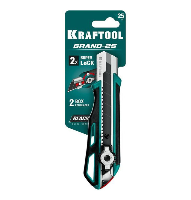 Ультраострое лезвие из углеродистой стали с заточкой, корпус из ударопрочного пластика с металлическими направляющими элементами для надежности.